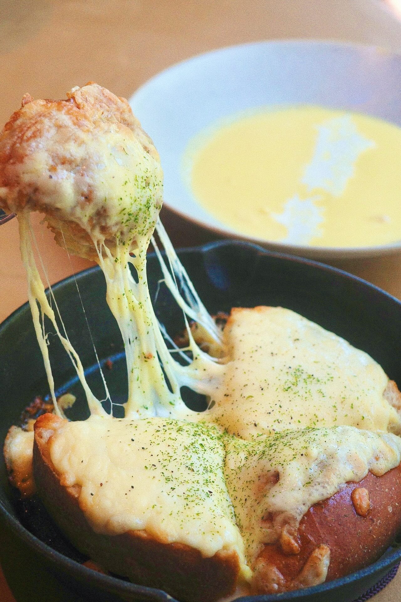 ぜひ、チーズパンにはスープを染み込ませて、がぶりとお召し上がりください。